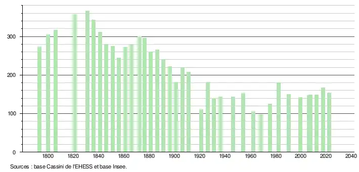 L'évolution du nombre d'habitants est connue à travers les recensements de la population effectués dans la commune depuis 1793. Pour les communes de moins de 10 000 habitants, une enquête de recensement portant sur toute la population est réalisée tous les cinq ans, les populations de référence des années intermédiaires étant quant à elles estimées par interpolation ou extrapolation[21]. Pour la commune, le premier recensement exhaustif entrant dans le cadre du nouveau dispositif a été réalisé en 2007[22].