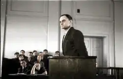 Une parodie de procès[8],[9] a lieu le et un témoignage contre Pilecki est présenté par le futur président du Conseil des ministres polonais Józef Cyrankiewicz, lui-même survivant d'Auschwitz. Pilecki est accusé de franchissement illégal de la frontière, d'utilisation de faux documents, de non-enrôlement dans l'armée, de port illégal d'armes (transport d'armes de guerre), d'espionnage pour le général Władysław Anders, d'espionnage pour « l'impérialisme étranger » — une métaphore pour désigner le service de renseignement britannique — et de projet d'assassinat de plusieurs responsables du ministère de la Sécurité publique polonaise.