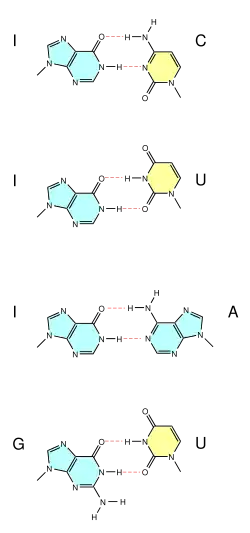 L'inosine (symbole I), base modifiée que l'on trouve fréquemment en première position de l'anticodon des ARNt, est particulièrement importante, car elle permet des appariements avec l'uracile (U), l'adénine (A) et la cytosine (C). La paire G–U est également très fréquente dans de nombreuses structures d'ARN.