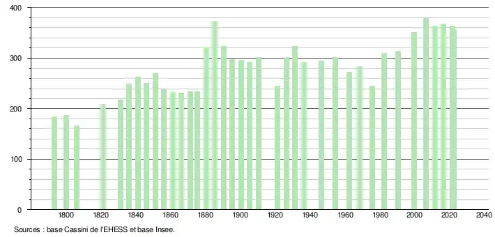 L'évolution du nombre d'habitants est connue à travers les recensements de la population effectués dans la commune depuis 1793. Pour les communes de moins de 10 000 habitants, une enquête de recensement portant sur toute la population est réalisée tous les cinq ans, les populations de référence des années intermédiaires étant quant à elles estimées par interpolation ou extrapolation[22]. Pour la commune, le premier recensement exhaustif entrant dans le cadre du nouveau dispositif a été réalisé en 2006[23].