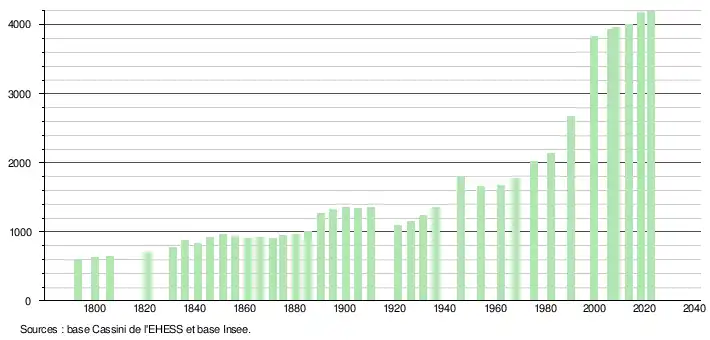 L'évolution du nombre d'habitants est connue à travers les recensements de la population effectués dans la commune depuis 1793. Pour les communes de moins de 10 000 habitants, une enquête de recensement portant sur toute la population est réalisée tous les cinq ans, les populations de référence des années intermédiaires étant quant à elles estimées par interpolation ou extrapolation[23]. Pour la commune, le premier recensement exhaustif entrant dans le cadre du nouveau dispositif a été réalisé en 2008[24].