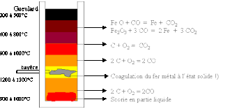 - Pendant le chauffage, le carbone diffusait dans le fer qui restait en phase solide formant de l'austénite. Il se formait cependant en surface du mélange une couche plus riche en carbone avec une température de fusion plus basse. Cette couche de fonte blanche fondait. Le forgeron savait que le carbone avait suffisamment diffusé et que l'acier avait la qualité recherchée quand il entendait le clapotis de la fonte en fusion[5]. Les feuilles vertes étaient destinées à produire de l'hydrogène qui favorisait la carburation. Le verre formait une couche protégeant le métal de l'oxydation[7] et captait les impuretés restantes.