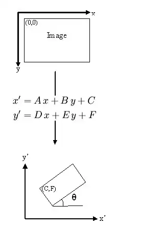 Le calcul des constantes a11, a12, a21 et a22 doit tenir compte que la rotation de l’image s’effectue par rapport au coin supérieur gauche de l’image (coordonnée 0,0 de l’image) et que l’axe des ordonnées de l’image est inversé par rapport à celui de la projection.