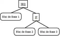 - L’étape suivante est relative à la description structurelle du code du programme. Elle est réalisée au travers d’une analyse de langage haut niveau en représentant un arbre syntaxique ayant pour feuilles les blocs de base ou les appels de fonction (CALL), et pour nœuds les séquences (SEQ), les conditions (IF), et les boucles (LOOP) d’instructions.