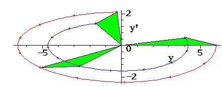 En bleu et en rouge sont représentées deux solutions particulières, dans l'espace des phases. L'aire du triangle formé par les deux solutions reste constante au cours du temps