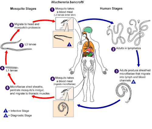 Devenues larves infectantes en 8 à 10 jours, elles finissent par se loger dans la gaine de la trompe du moustique. L'inoculation n'est pas directe. Quand le moustique pique, la gaine ne pénètre pas dans la plaie. Elle se plie, s'ouvre et les larves sont libérées sur les téguments du sujet neuf ; celles-ci le pénètrent alors activement, soit par l'orifice de la piqûre, soit le long des follicules pileux, pour gagner son système lymphatique profond, et après deux mues, donner des adultes au bout de 3 mois[1].