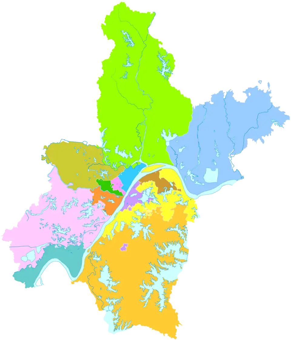 - ↑ (zh-Hans) « Archived copy » [archive du ], National Bureau of Statistics of the People's Republic of China, (consulté le ) : « 统计用区划代码 名称 420101000000 市辖区 420102000000 江岸区 420103000000 江汉区 420104000000 硚口区 420105000000 汉阳区 420106000000 武昌区 420107000000 青山区 420111000000 洪山区 420112000000 东西湖区 420113000000 汉南区 420114000000 蔡甸区 420115000000 江夏区 420116000000 黄陂区 420117000000 新洲区 ».