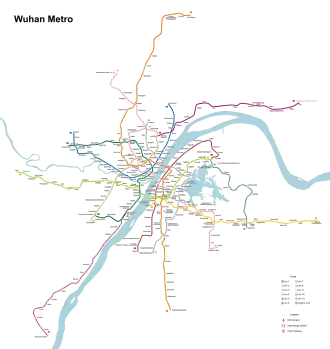Wuhan est à la jonction des voies à grande vitesse qui relient les principales agglomérations du pays : du nord au sud entre Pékin et Guangzhou, et d'ouest en est entre Shanghai et Chongqing[34]. La ville dispose de trois gares principales :