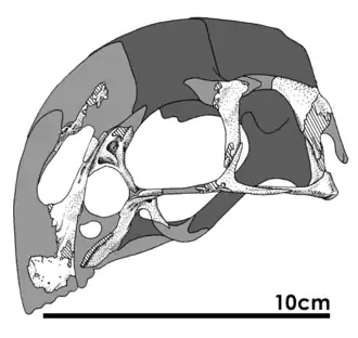 Reconstitution du crâne de Wulatelong gobiensis avec, en blanc, les os retrouvés.