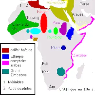 Califat hafside ; Kanem ; Touaregs ; 1-Mérinides ; 2 - Abdalwadides ; empire du Mali. Éthiopie ; Aloa ; Toundjour.