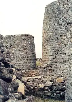 - Vers 1250 : des peuplades d’origine shona (Bantou) s’installent sur le territoire occupé par les mineurs batonga, au Botswana[7]. Ces Shonas auraient soumis les mineurs et seraient les premiers constructeurs de la ville de Zimbabwe en Afrique du Sud-Est (1250-1450), composée d'enclos de pierre elliptiques[8]. Avant son déclin au XVe siècle, le Grand Zimbabwe couvre 40 ha. On compte une centaine d’enclos dans la région, certains abritant de simples familles, mais d’autres comme à Tchoumnougoua et Manékouéni sont des capitales territoriales. L’ensemble forme un système intégré relié à la côte. Les vastes enclos de pierre du Grand Zimbabwe sont certainement les résidences de l’oligarchie qui contrôle la production de l’or du plateau. Peut-être sont-ils utilisés religieusement car de nombreux objets rituels, dont des figurines de stéatite, ont été retrouvés sur le site.