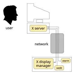 - le serveur X fonctionne sur un terminal intelligent (client léger) doté d'un écran, d'un clavier et d'une souris ; à travers le réseau :