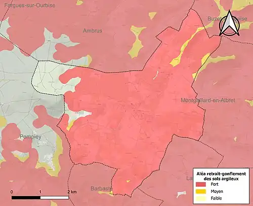 Le retrait-gonflement des sols argileux est susceptible d'engendrer des dommages importants aux bâtiments en cas d’alternance de périodes de sécheresse et de pluie[20]. 92 % de la superficie communale est en aléa moyen ou fort (91,8 % au niveau départemental et 48,5 % au niveau national)[21]. Depuis le , en application de la loi ELAN, différentes contraintes s'imposent aux vendeurs, maîtres d'ouvrages ou constructeurs de biens situés dans une zone classée en aléa moyen ou fort[Note 2],[22].