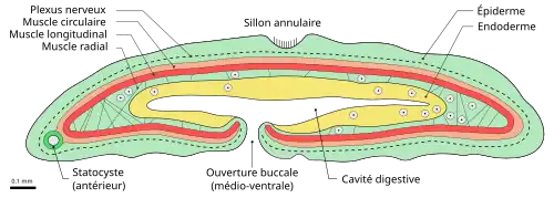 Trois jours après l'éclosion, la formation d'une touffe apicale de cils plus longs que les autres déjà présents, se développe à la pointe antérieure. Cette caractéristique commune aux larves est la seule ressemblance que possède l'embryon avec cette dernière. Cette structure permet de révéler, à ce stade de nage, la présence d'un système nerveux et une coordination du comportement de nage, puisqu'elle permet le changement de direction au contact d'un obstacle[22]. Étape par étape, les cellules épidermiques du nouveau-né se différencient, à l'exception de celles à l'intérieur de celui-ci. C'est pourquoi il est impossible de remarquer la présence d'une bouche, d'un anus, de bandes ciliaires, de crête larvaire, d'un cœlome ou d'un système digestif. Cette observation indique que l'embryon ne se nourrit pas.
