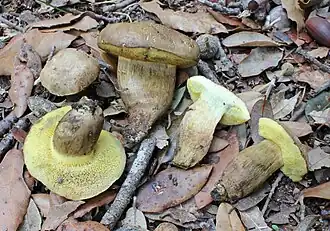 - Le Bolet cisalpin (Xerocomellus cisalpinus), à la moitié inférieure du pied typiquement très bleuissante à la coupe.