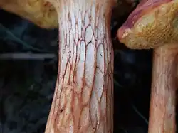 Son stipe est cylindrique à subclavé avec la base rétrécie à tendance radicante, il est orné d'un réseau rougeâtre net en relief au moins dans sa partie supérieure[4],[5].