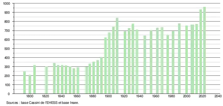 L'évolution du nombre d'habitants est connue à travers les recensements de la population effectués dans la commune depuis 1793. Pour les communes de moins de 10 000 habitants, une enquête de recensement portant sur toute la population est réalisée tous les cinq ans, les populations de référence des années intermédiaires étant quant à elles estimées par interpolation ou extrapolation[19]. Pour la commune, le premier recensement exhaustif entrant dans le cadre du nouveau dispositif a été réalisé en 2007[20].