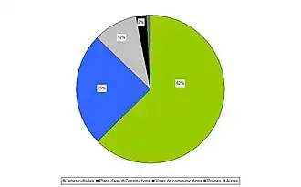 Les terres cultivées occupent 887,511 km2, les plans d'eau 351,571 km2, la superficie construite (résidentielle et industrielle) 138,391 km2, les voies de communications 34,807 km2, les prairies 7,584 km2, les forêts 1,736 km2, les friches 1,187 km2 et les vergers 1,655 hectare.