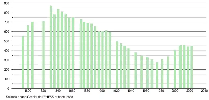 L'évolution du nombre d'habitants est connue à travers les recensements de la population effectués dans la commune depuis 1793. Pour les communes de moins de 10000habitants, une enquête de recensement portant sur toute la population est réalisée tous les cinqans, les populations de référence des années intermédiaires étant quant à elles estimées par interpolation ou extrapolation[17]. Pour la commune, le premier recensement exhaustif entrant dans le cadre du nouveau dispositif a été réalisé en 2007[18].