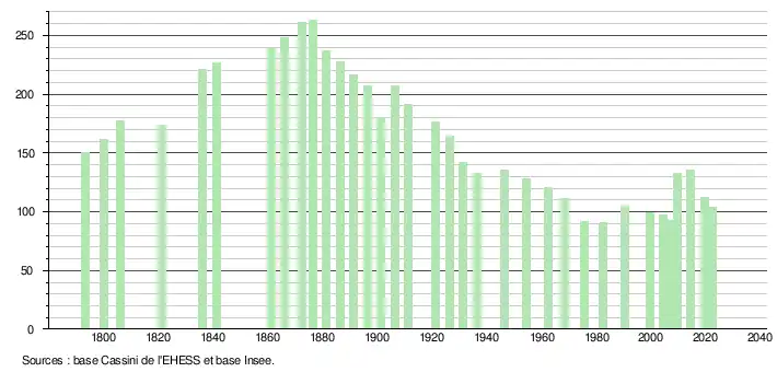 L'évolution du nombre d'habitants est connue à travers les recensements de la population effectués dans la commune depuis 1793. Pour les communes de moins de 10 000 habitants, une enquête de recensement portant sur toute la population est réalisée tous les cinq ans, les populations de référence des années intermédiaires étant quant à elles estimées par interpolation ou extrapolation[18]. Pour la commune, le premier recensement exhaustif entrant dans le cadre du nouveau dispositif a été réalisé en 2004[19].