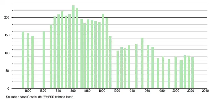 L'évolution du nombre d'habitants est connue à travers les recensements de la population effectués dans la commune depuis 1793. Pour les communes de moins de 10 000 habitants, une enquête de recensement portant sur toute la population est réalisée tous les cinq ans, les populations de référence des années intermédiaires étant quant à elles estimées par interpolation ou extrapolation[27]. Pour la commune, le premier recensement exhaustif entrant dans le cadre du nouveau dispositif a été réalisé en 2007[28].