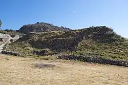Situé au nord du palais, l'édifice U est le plus haut du site, et on jouit depuis son sommet d'une vue sur toute la cité ; son côté ouest est partiellement effondré. Il abrite également une tombe. Son côté nord donne sur un promontoire rocheux dominant une pente abrupte rejoignant la vallée.