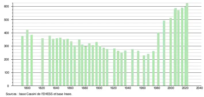 L'évolution du nombre d'habitants est connue à travers les recensements de la population effectués dans la commune depuis 1793. Pour les communes de moins de 10 000 habitants, une enquête de recensement portant sur toute la population est réalisée tous les cinq ans, les populations de référence des années intermédiaires étant quant à elles estimées par interpolation ou extrapolation[29]. Pour la commune, le premier recensement exhaustif entrant dans le cadre du nouveau dispositif a été réalisé en 2005[30].