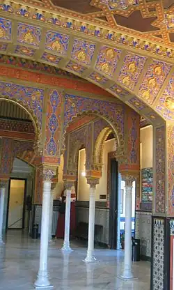 A l'Alhambra, la polychromie est quasiment complètement effacée par le temps, mais on la retrouve néanmoins dans les copies qui furent exécutées de l'Alhambra, telles par exemple l'auberge de jeunesse Santa Mare de Deu del Coll à Barcelone.