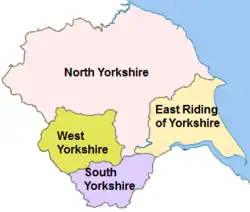 Le Yorkshire est traditionnellement divisé en trois ridings, terme d'origine viking dérivé de threthingr « tiers, troisième partie » : le North Riding, le West Riding et l'East Riding. Ces ridings étaient à leur tour subdivisés en wapentakes.