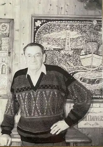 « Yves Durand, artiste en coquillage de Lesconil, près de Pont-l’Abbé. Il tient avant tout à souligner que les couleurs de ses tableaux sont naturelles sans aucun colorant ni peinture.