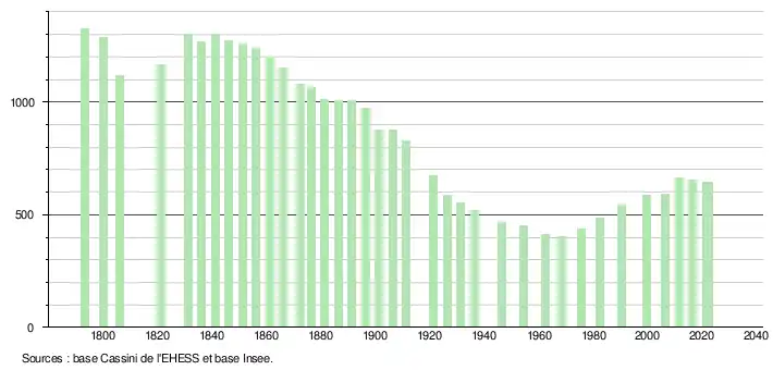 L'évolution du nombre d'habitants est connue à travers les recensements de la population effectués dans la commune depuis 1793. Pour les communes de moins de 10 000 habitants, une enquête de recensement portant sur toute la population est réalisée tous les cinq ans, les populations de référence des années intermédiaires étant quant à elles estimées par interpolation ou extrapolation[24]. Pour la commune, le premier recensement exhaustif entrant dans le cadre du nouveau dispositif a été réalisé en 2006[25].