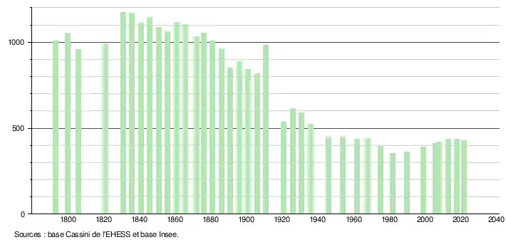 L'évolution du nombre d'habitants est connue à travers les recensements de la population effectués dans la commune depuis 1793. Pour les communes de moins de 10 000 habitants, une enquête de recensement portant sur toute la population est réalisée tous les cinq ans, les populations de référence des années intermédiaires étant quant à elles estimées par interpolation ou extrapolation[28]. Pour la commune, le premier recensement exhaustif entrant dans le cadre du nouveau dispositif a été réalisé en 2008[29].