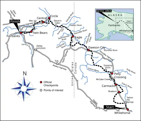 Le tracé de la course varie légèrement d'année en année pour diverses raisons, dont les chutes de neige et le gel sur le Yukon. Sa longueur varie également : l'édition 2003, abrégée à cause du temps, parcourait 1 482 km[5], tandis que celle de 1998 s'étendait sur 1 646 km[6]. La course se dispute dans le sens Fairbanks-Whitehorse les années impaires et dans le sens contraire les années paires[7].