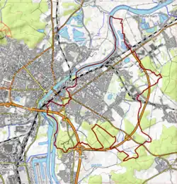L'occupation des sols de la commune, telle qu'elle ressort de la base de données européenne d’occupation biophysique des sols Corine Land Cover (CLC), est marquée par l'importance des territoires artificialisés (47,9 % en 2018), en augmentation par rapport à 1990 (35 %). La répartition détaillée en 2018 est la suivante : zones urbanisées (34,3 %), terres arables (17,5 %), forêts (15,7 %), prairies (13,7 %), zones industrielles ou commerciales et réseaux de communication (9 %), eaux continentales[Note 5] (2,8 %), zones agricoles hétérogènes (2,5 %), espaces verts artificialisés, non agricoles (2,4 %), mines, décharges et chantiers (2,2 %)[16]. L'évolution de l’occupation des sols de la commune et de ses infrastructures peut être observée sur les différentes représentations cartographiques du territoire : la carte de Cassini (XVIIIe siècle), la carte d'état-major (1820-1866) et les cartes ou photos aériennes de l'IGN pour la période actuelle (1950 à aujourd'hui)[Carte 3].