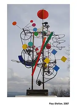 Ses sculptures en fer sont principalement faites de fil de fer et contiennent de nombreux éléments ludiques. Le mouvement et la surprise font toujours partie de l'œuvre d'art. Il donne à nombre de ses objets souvent cinétique des jeux de mots.