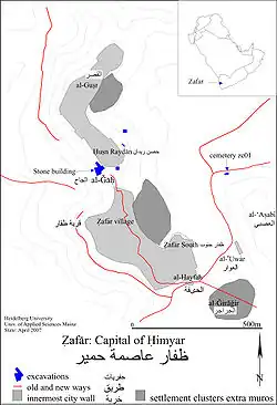 Situé dans les hauts-plateaux, à une altitude de 2800 mètres, à 10 km de Yarim, le site a été, avant la conquête axumite, la capitale de la confédération tribale himyarite, qui, de 110 av. J.-C. à 525 apr. J.-C., a dirigé la majeure partie de la péninsule arabique, à son apogée, avec ses alliés, jusqu'à l'Euphrate.