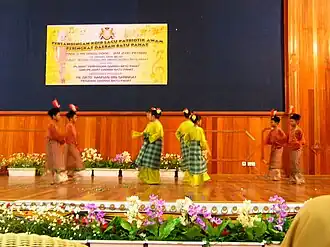Les danseurs dansent généralement par paire et sont accompagnés par un ensemble musical traditionnel normalement constitué de gambus, d'accordéons, de violons, de marwas (bongos), de rebanas (sorte de tambourin) et de dok.