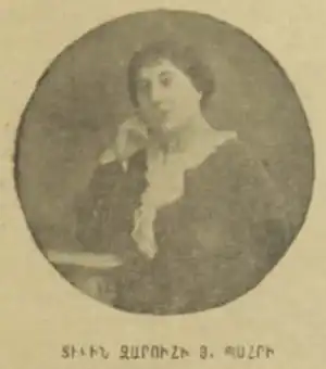 Durant cette période, elle devient également membre de l'Association des femmes arméniennes[2]. Elle fait partie des contributrices régulières du journal des femmes arméniennes, Haï Guine, dans lequel elle discute notamment de la place des femmes dans la société arménienne de son époque[2]. Dans un numéro paru en 1921, elle prône ainsi l'avènement d'une « nouvelle femme » qui serait l'égale de l'homme non pas pour prendre l'ascendant sur lui mais parce qu'obtenir l'égalité serait bénéfique pour l'humanité tout entière[8],[9].