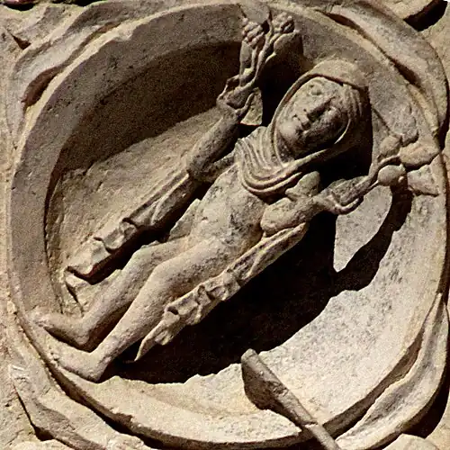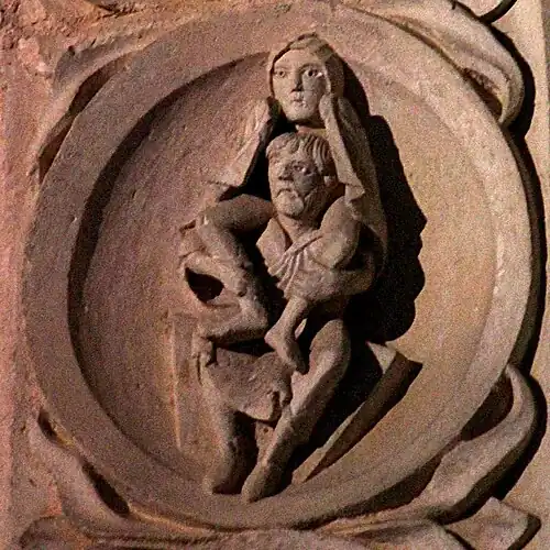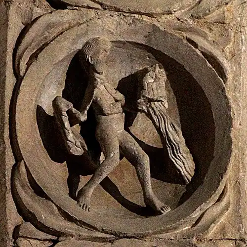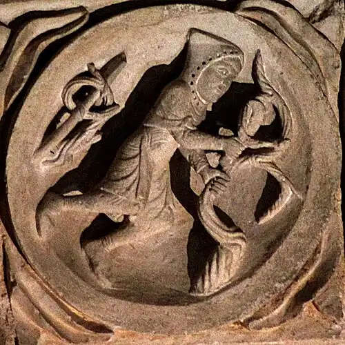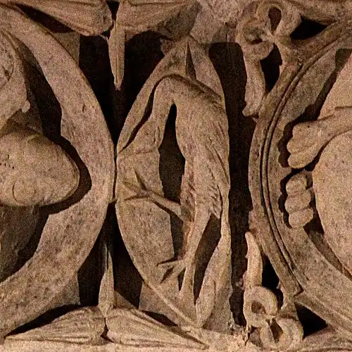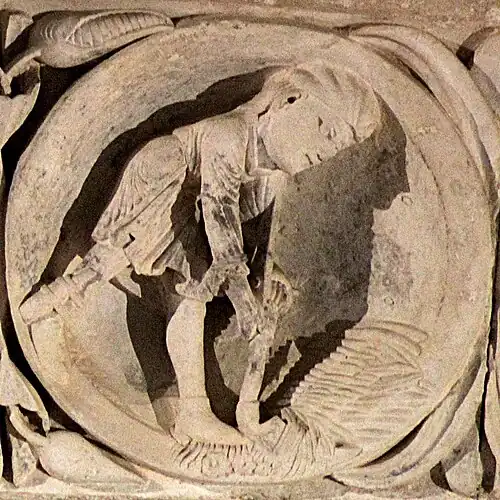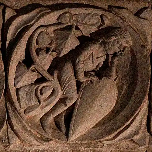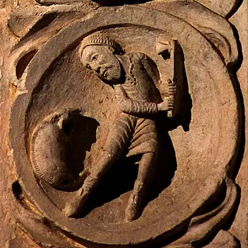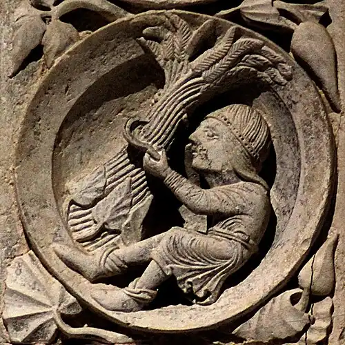 Le médaillon est plus probablement à rapprocher de son symétrique du côté droit, qui représente un homme en train d'engranger la récolte. L'ensemble peut alors être compris comme une figure allégorique rappelant « si le grain de blé qui est tombé en terre ne meurt, il reste seul; mais, s'il meurt, il porte beaucoup de fruit » (Jn 12:24).