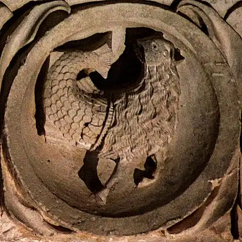 Les Poissons sont entre février et mars. Représentation traditionnelle de deux poissons tête-bêche, reliés par une corde. Dans la symbolique chrétienne, les deux poissons représentent l'ancien et le nouveau testament.