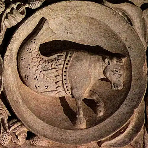 Le Taureau se situe entre avril et mai. De même que le bélier, il est représenté ici avec une queue de poisson.