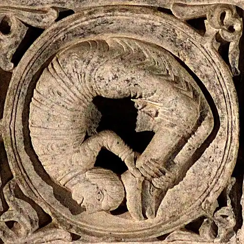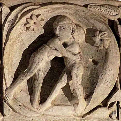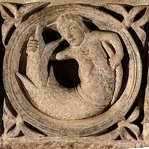 Après le chien se mordant la queue, deux médaillons représentent un acrobate se tenant les jambes, et une sirène se tenant la queue.