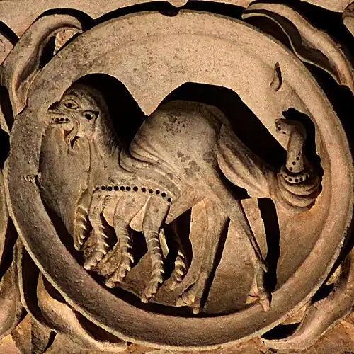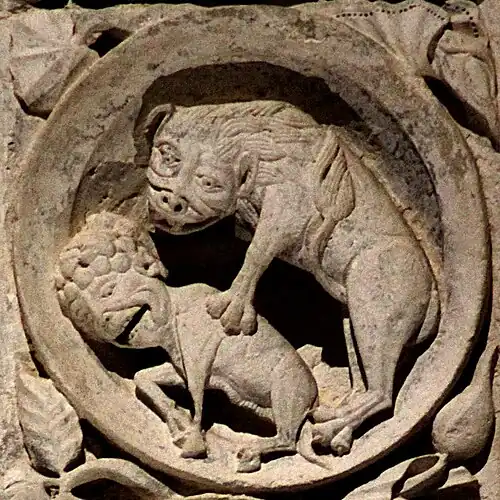 Le lion se situe entre juillet et août. Il est représenté ici en train de terrasser un bovidé à figure terrifiée et étrangement humaine.