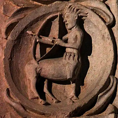 Le sagittaire, entre novembre et décembre, est représenté sous les traits d'un centaure, un arc et des flèches à la main.