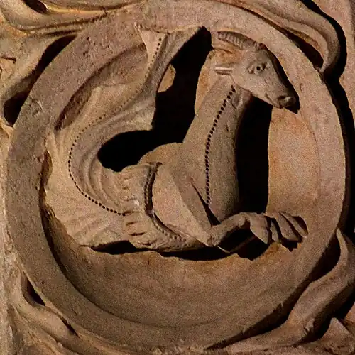 Le Capricorne, entre décembre et janvier, est représenté avec un corps de chèvre et une queue de poisson. Au début de ce signe, le passage au solstice d'hiver marque le début d'une nouvelle année astronomique.