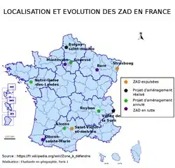 L'installation des premiers zadistes à Notre-Dame-des-Landes a commencé en 2009, à la suite de l'organisation d'un Camp Action Climat[16]. Les ZAD se sont multipliées en France après l'expulsion manquée de celle de Notre-Dame-des-Landes à l'automne 2012[17]. L'une des premières à se monter après l'échec de l'évacuation de la ZAD serait la ferme des Bouillons, près de Rouen, occupée contre un projet immobilier du groupe Auchan[18] dès l'hiver 2012. Outre le cas de la ZAD de Notre-Dame-des-Landes, les cas les plus connus sont ceux de l'opposition au projet du barrage de Sivens, dans le Tarn, au Center Parcs de la forêt de Chambaran, en Isère et au Grand Contournement Ouest de Strasbourg. Avant l'expulsion réussie de plusieurs d'entre elles, la France a compté au maximum une quinzaine de ZAD, dont moins de la moitié sont ou étaient des ZAD « pleines » (Notre-Dame-des-Landes, Sivens, Roybon, les ZAD des Bouillons près de Rouen, Saint-Victor-et-Melvieu, Avignon, Décines), avec un nombre d'occupants permanents variant entre 200 et 300[16].