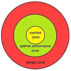 La zone de confort est un état psychologique dans lequel une personne se sent à l'aise. Dans cette zone, elle peut garder le contrôle tout en éprouvant un faible niveau de stress et d'anxiété. Dès lors, un niveau constant de performance est possible[1].