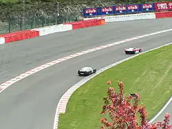 Puis vient une surface recouverte d'environ 4 cm d'épaisseur d'enrobé bitumineux. Par l'adjonction de proportions soigneusement calculées de sables de calcaire et de grès, et de quelques additifs chimiques, on obtient ainsi une fine rugosité, et par là un engrènement entre le caoutchouc des pneus et le sol plus fort que pour un revêtement de chaussée ordinaire[8]. Cette bande d'asphalte se raccorde parfois à un bac à gravier d'au moins 4 mètres de large et de 25 cm de profondeur. Ce dernier est composé, selon les instructions de la FIA de cailloux ronds de diamètre compris entre 5 et 16 mm. Au bout du bac à gravier se trouve une barrière de 2 à 6 rangées de pneus, haute d'au moins 1 m. La rangée la plus en avant doit être recouverte d'un plan de caoutchouc d'au moins 12 mm d'épaisseur, pour empêcher la voiture de pénétrer entre les pneus ou de s'y accrocher. Ce genre de construction peut absorber jusqu'à 80 % de l'énergie du choc. Encore derrière, la zone de dégagement est limitée par un mur ou une glissière de sécurité surmonté d'une grille de protection, pour éviter les collisions avec des voitures circulant sur des voies voisines, ou la mise en danger des spectateurs et des auxiliaires de piste par des pièces projetées par les voitures sorties de piste.
