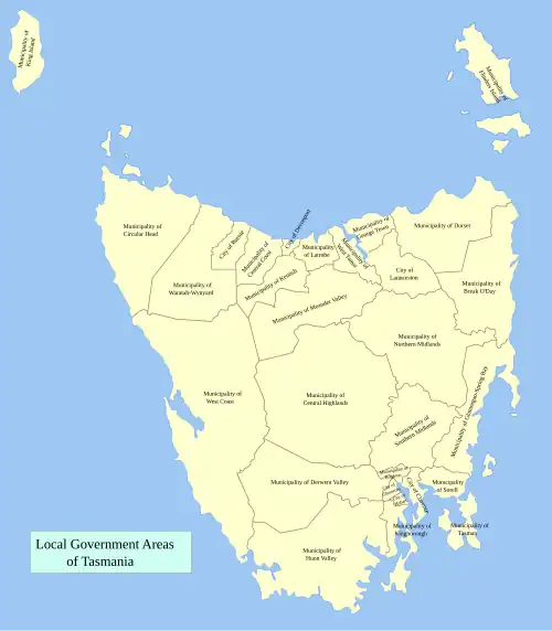 L'état australien de Tasmanie est divisé en 29 zones d'administration locales. Ces zones de gouvernement local (LGA), sont généralement appelées « conseils ». Ce niveau de gouvernement a la charge de la gestion des affaires locales telles que l'entretien des routes, l'urbanisme ou la gestion des déchets.