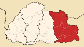 | Est | ![]() | Lhuntse Mongar Pemagatshel Samdrup Jongkhar Trashigang Trashiyangste | Mongar | 14 026 km2 | 440 000 |